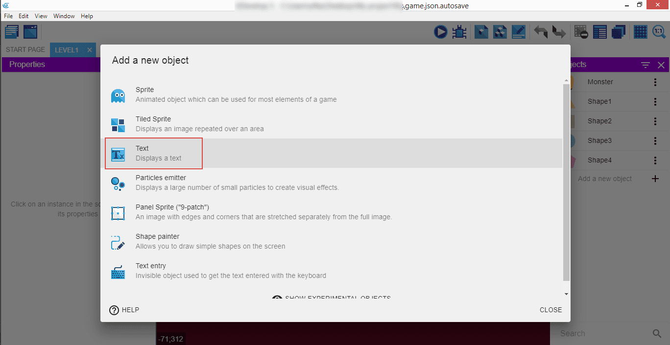 Click on the "Level1" tab, then "Add a new object".