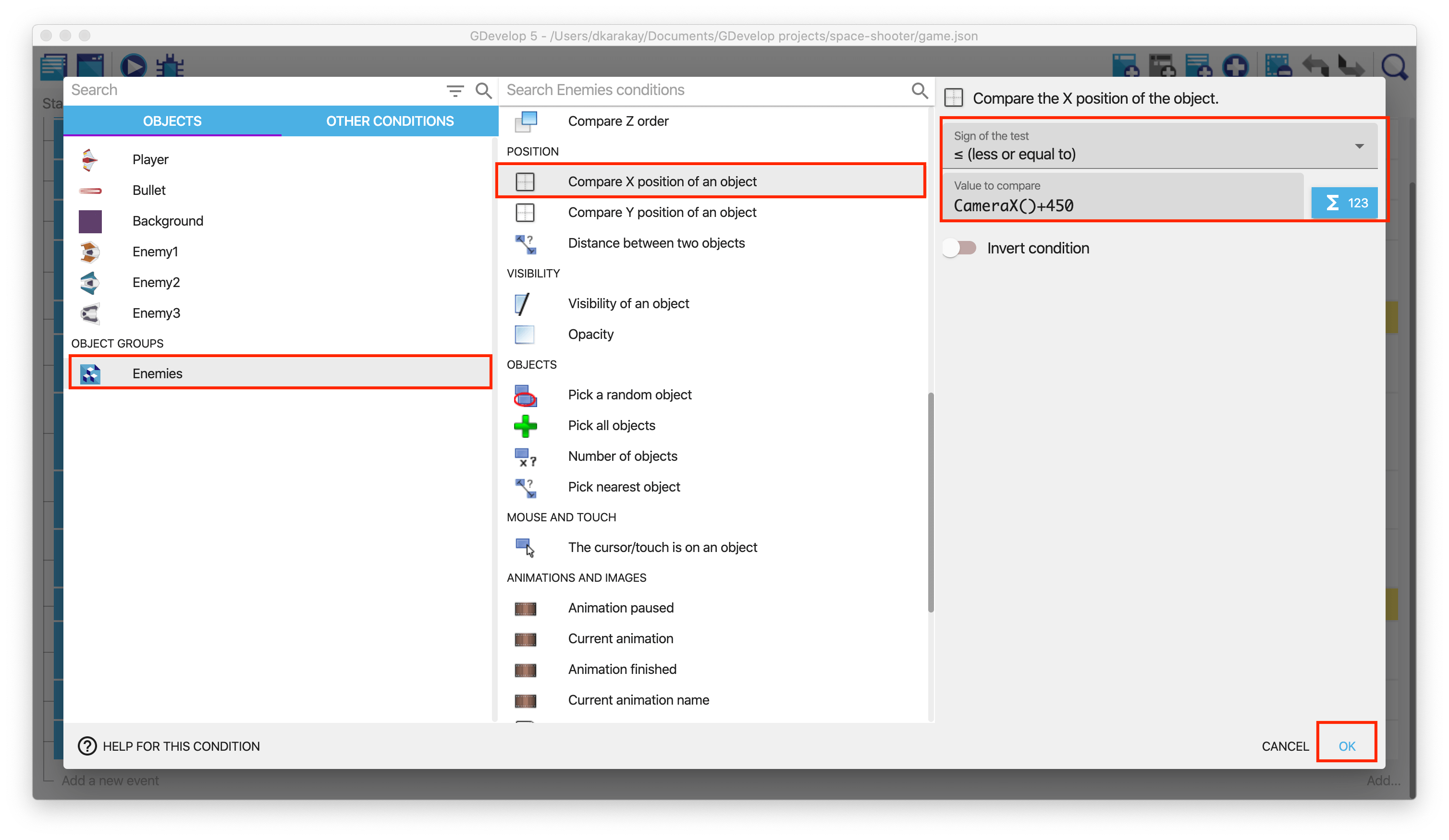 Finally, we need to give a force to move enemies. However, we should provide a force when they are on the camera. Hence, we will add a new condition to perform our idea. In this condition, we are looking at the Enemies' X position when it is less than the center Camera X position + 450. Make sure that less or equal to is selected in the sign of the test.